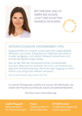 Judith Ruppelt arbeitet als Heilpraktikerin mit der Therapieform der Intrapsychischen Systemarbeit.